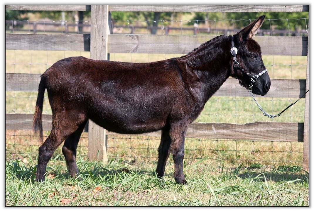 HHAA A Penny Saved, dark brown miniature donkey jennet for sale at Half Ass Acres in Chapel Hill, Tennessee.