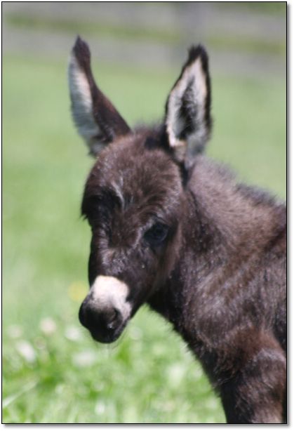 This beautiful dark brown jennet is an absolute joy to us. She has entertained us and all our farm visitors since her first day out of her stall. She is so elegant and full of herself with her high energy and very outgoing personality. We named her Geisha Girl as she has a defined beauty, entertains us with her dancing and prancing, and is very unique in so many ways. Her head is very upright, straight legs, perfect bit, and beautiful distinct color. Trying to get pictures of Geisha is nearly impossible as she comes running to all who enter her paddock. She greets everyone and surrounds them with so much attention that one is hardly aware there are other donkeys. Geisha Girl has personality plus which captures her beauty and the attention of all who come to our farm. I had to get Joe to help me take her pictures ……she kept getting right in my face. I could not back away fast enough before she was in my lap and I was laughing and playing with her rather than taking her pictures for everyone to see.