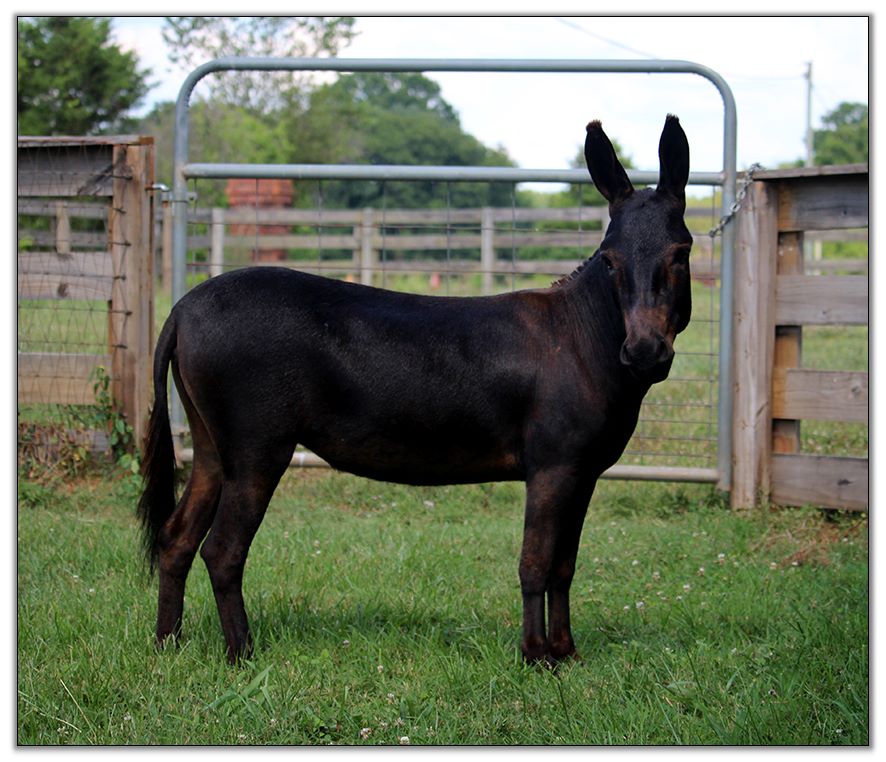 Queen Bee is an 'in your pocket' donkey. She does not care what you do to her as long as she is getting attention. I washed and body clipped her all by myself with no trouble at all...even her ears. This was the first time she had ever been clipped and it will take her dark color a few weeks to fully come in. (Updated photos/videos have been posted.) She is very heavy boned with an extra wide chest and rear. She is up to date on all vaccinations including West Nile and Rabies.