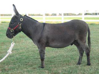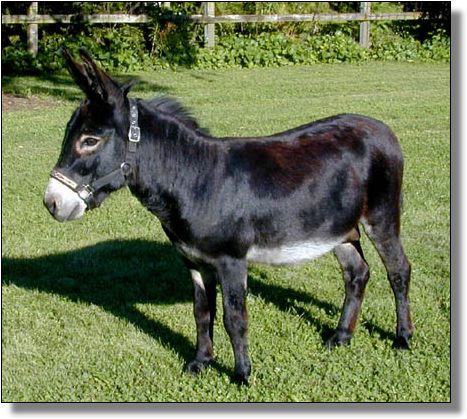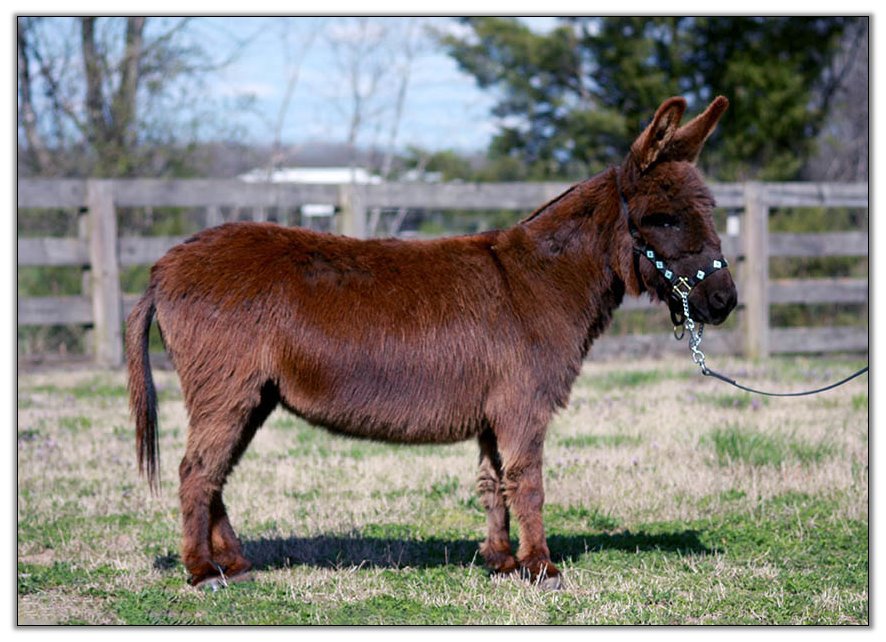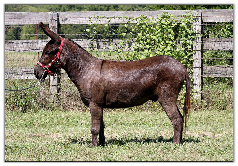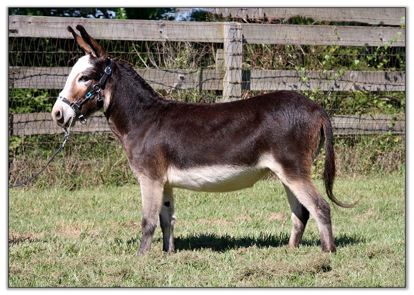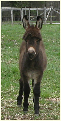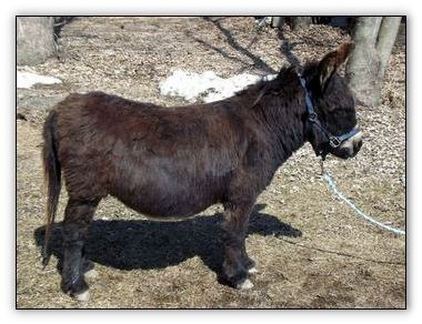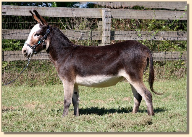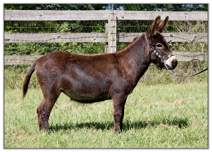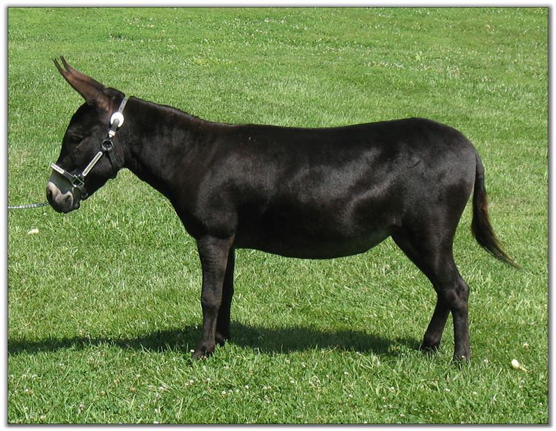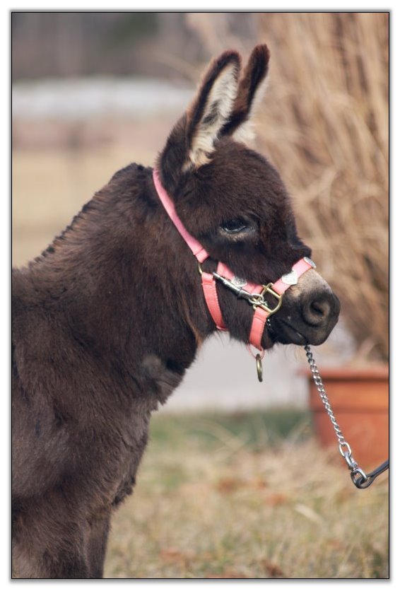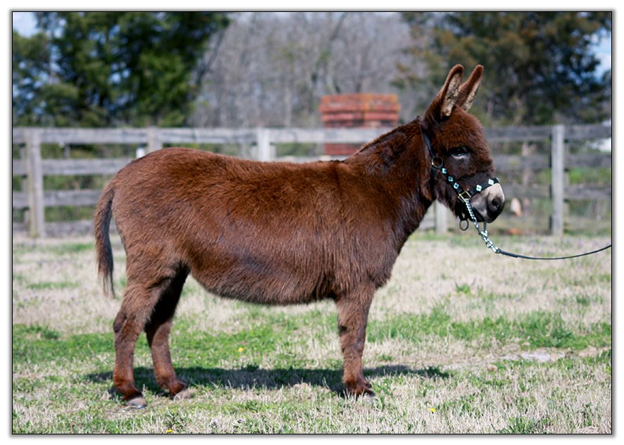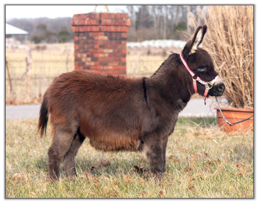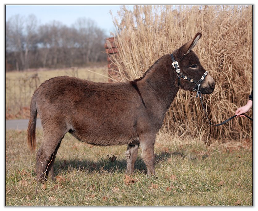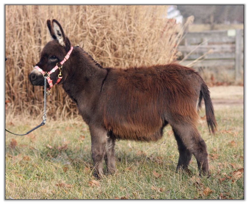 For such a small donkey Baby is super correct with nice width in front and back, a perfect topline, straight legs and a fantastic hip. She has a beautiful, small head. She is dark brown with white points but looks almost black when she sheds out in the summer. Her sire is Sunset Acres Rowdy Yates (sadly now deceased), and her pedigree includes Little Motown,My World Buster, and Pine Grove Farm’s Peppercorn Jack.