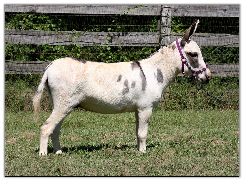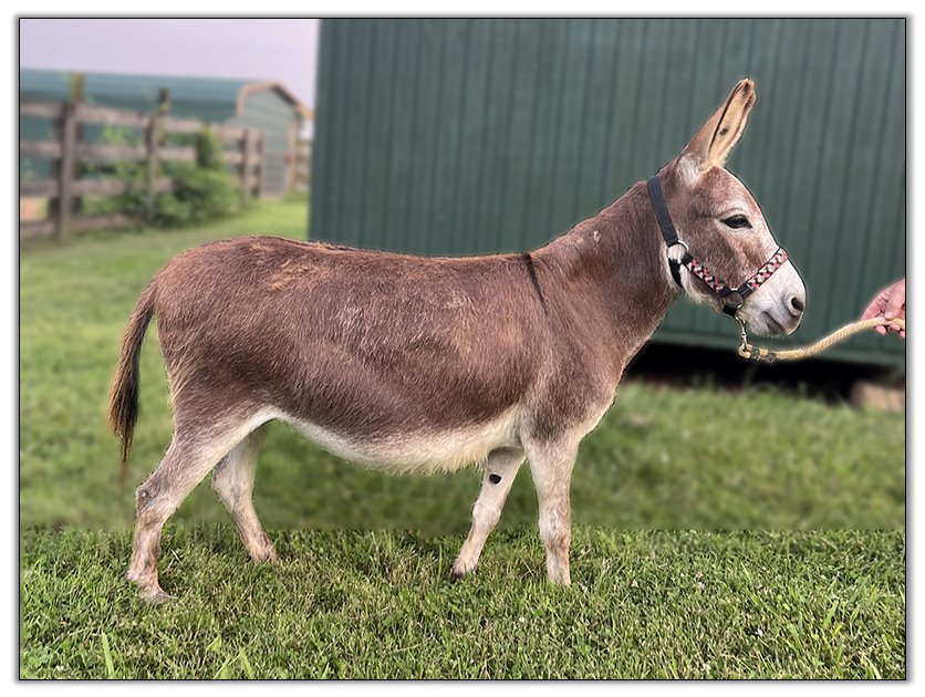 Moonshine arrived at Half Ass Acres all the way from New York in December of 2018 along with five of her stablemates. Her owner has been diagnosed and is being treated for a very serious illness and she decided it was time to place her donkeys in another home. We are honored that she trusts us to give the best of care to her precious donkeys from her outstanding breeding program. We are having difficulty getting Moonshine to settle in foal at this time. Moonshine has now been separated from Goose. The last time we observed her in season was on 3/21/21.
