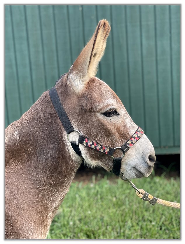 Speedy arrived at Half Ass Acres all the way from New York in December of 2018 along with five of his stablemates. His owner has been diagnosed and is being treated for a very serious illness and she decided it was time to place her donkeys in another home. She chose to sell half interest in them to us so that she could stay involved in their lives. We are honored that she trusts us to give the best of care to her precious donkeys from her outstanding breeding program.