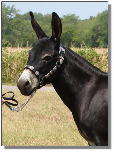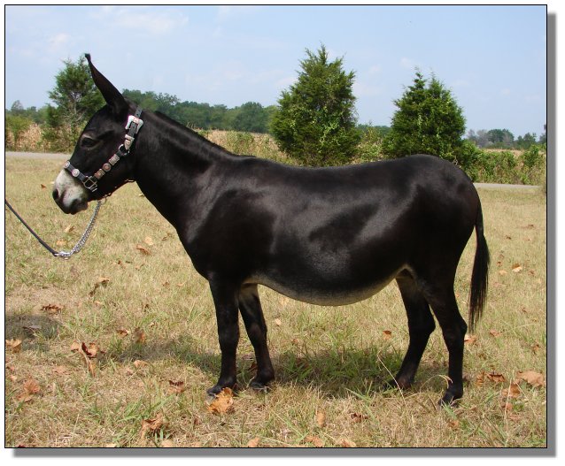 Full Sister to Rai,  32 1/2" Spotted Jack and Heaven's To Betsy, spotted jennet.  Bred to Jiggs for a late 2000 foal.  This will be her first foal.